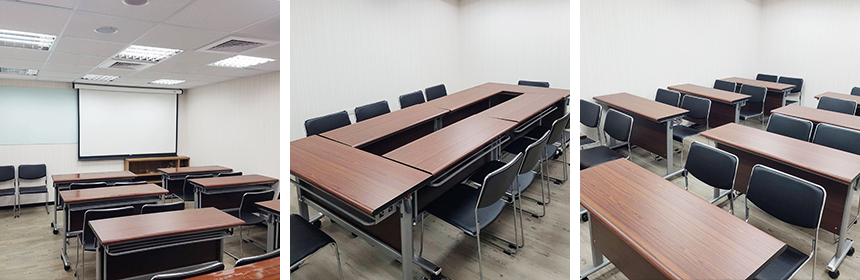 會議室空間約可容納20-30人,可自行擺設佈置,以滿足各種會議、說明會、教育訓練等需求